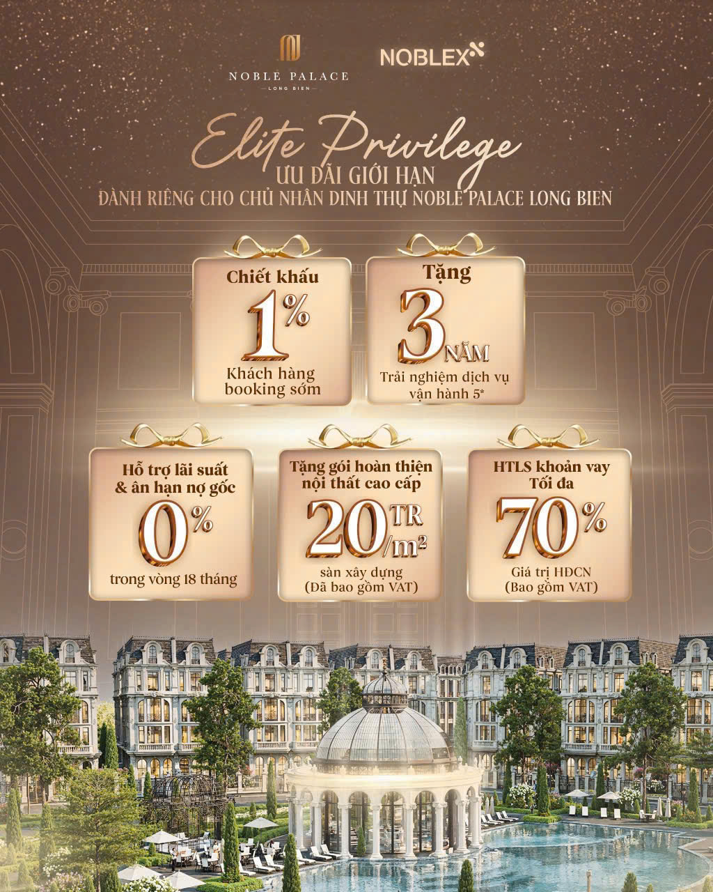 Noble Palace Long Biên được xây dựng trên tổng diện tích 43.070m2, được thiết kế đồng bộ với chuỗi biệt thự sang trọng, đẳng cấp và hệ thống shophouse hiện đại, thời thượng. Lấy cảm hứng từ phong cách kiến trúc cổ điển Châu Âu, những căn shophouse và biệt thự tại Noble Palace mang một vẻ đẹp thanh nhã, sắc sảo tới từng đường nét. Với dự án này, nhà phát triển Noble mang đến một công trình kiến trúc độc đáo, sang trọng, một khu thương mại sầm uất tại Long Biên và đem đến cho khách hàng cơ hội sở hữu một sản phẩm bất động sản đẳng cấp.